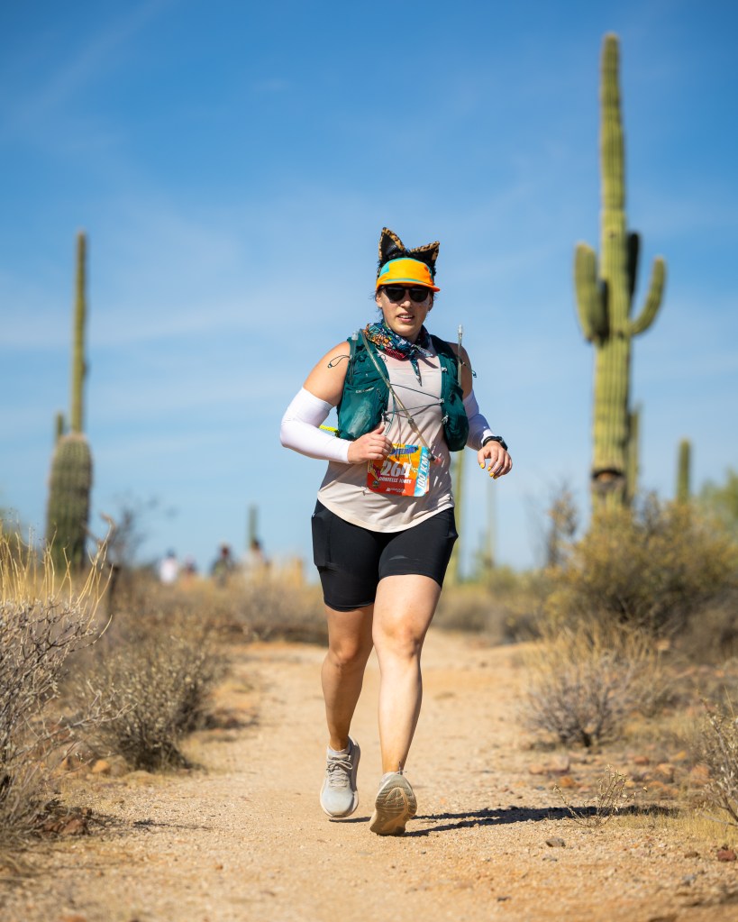 Loop 1 begins and I’m off! I started near the back because I knew I wanted to start conservatively and not go out too hard, but then all of a sudden I’m on single track for kilometers and everyone is walking (and it’s a flat trail). I was kicking myself a little bit for letting myself get stuck so far back, but eventually found myself being able to pass and find a more comfortable pace around km 5. Javelina is a course with a generous cutoff for the 100k (29 hours for the 100km and 30 hours for the 100mile), so it attracts folks that are looking for more time to complete the course (while also, of course, attracting ALL of the elite racers, chasing those elusive Golden tickets). I approached the first aid station earlier than I thought I’d see one, I didn’t really need much from the aid station, but then remembered Bre’s advice and quickly added ice to my ice bandana and then soaked my arm sleeves with the sponges in the ice water. The air still felt cool, and I could feel the cooling from my arm sleeves almost immediately. The rest of the loop went by pretty much without a hitch. I ran through some beautiful saguaros, and enjoyed the views from the course for the first time. I was excited to get back to race JQ (jeadquarters) so that I’d get to see my crew! I finished Lap 1 in 4:45 and knew that Lap 2 was where the real test would be as the day was calling for record-breaking heat of 36 degrees.